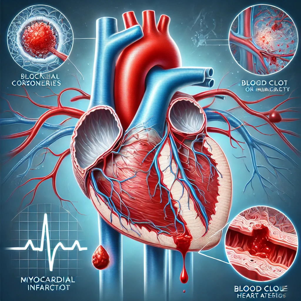 심근경색(Myocardial Infarction)은 관상동맥이 막히거나 좁아져 심장 근육에 산소와 영양분이 공급되지 않아 조직이 손상되는 상태를 말합니다. 주된 원인은 동맥경화로 인해 관상동맥이 좁아지는 것입니다. 동맥경화는 혈관 벽에 지방과 콜레스테롤이 쌓여 플라크를 형성하며, 이 플라크가 파열되면 혈전이 생겨 혈류를 차단하게 됩니다.