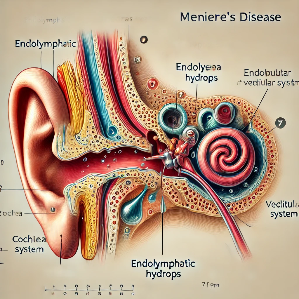 메니에르병은 내이의 림프액(내림프)의 순환 이상으로 인해 발생하는 질환입니다. 내이는 청각과 균형을 담당하는 중요한 기관으로, 림프액의 양이 증가하거나 배출이 원활하지 않으면 내림프 수종(endolymphatic hydrops)이 발생해 메니에르병 증상을 유발합니다. 주로 40~60대에서 발생하며, 여성보다 남성에게 조금 더 흔하게 나타납니다.