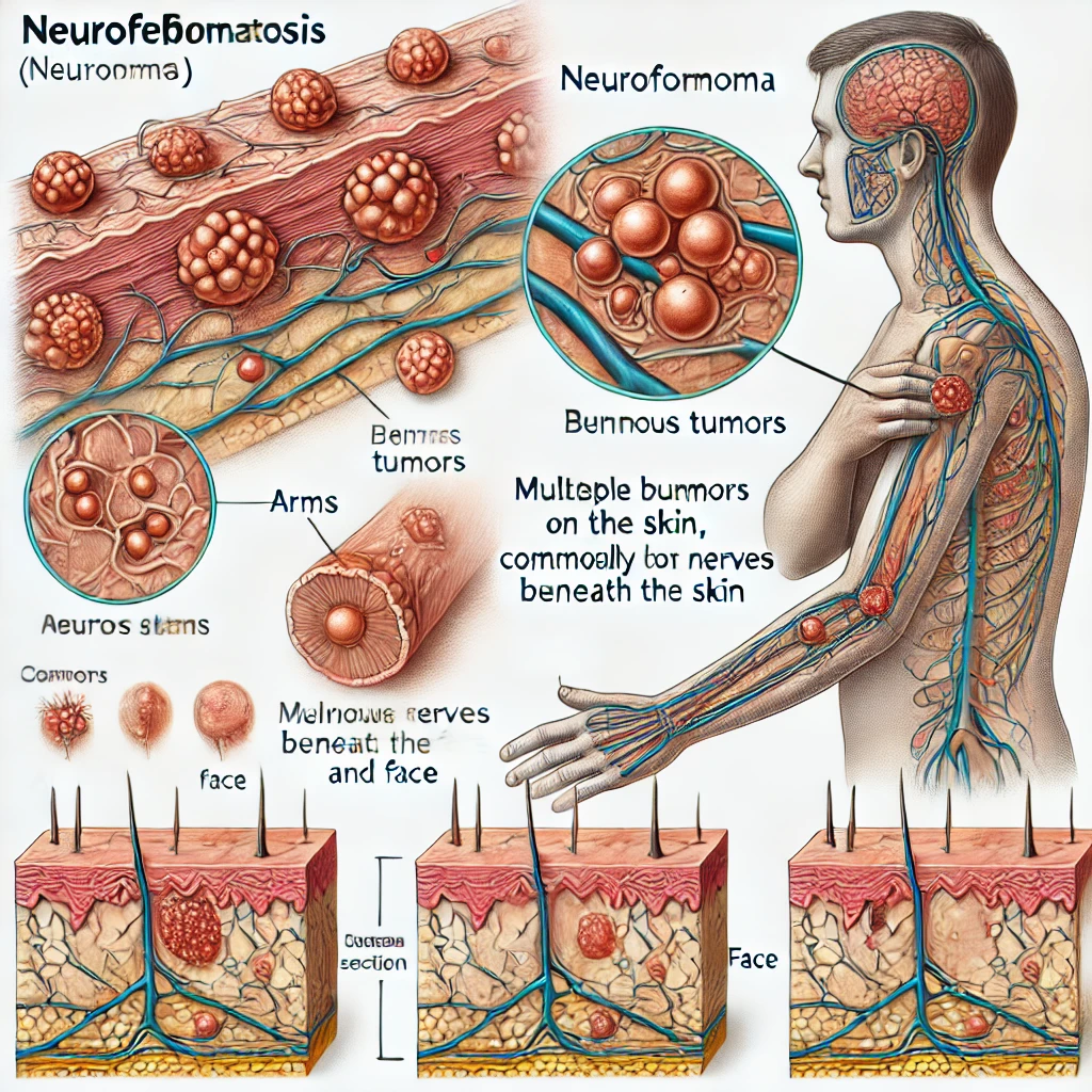 신경섬유종은 신경을 둘러싼 신경초에서 발생하는 신경계 종양입니다. 신경섬유종증(Neurofibromatosis, NF)이라는 유전 질환과 연관이 있는 경우가 많으며, 특히 **제1형 신경섬유종증(NF1)**과 관련이 깊습니다.
