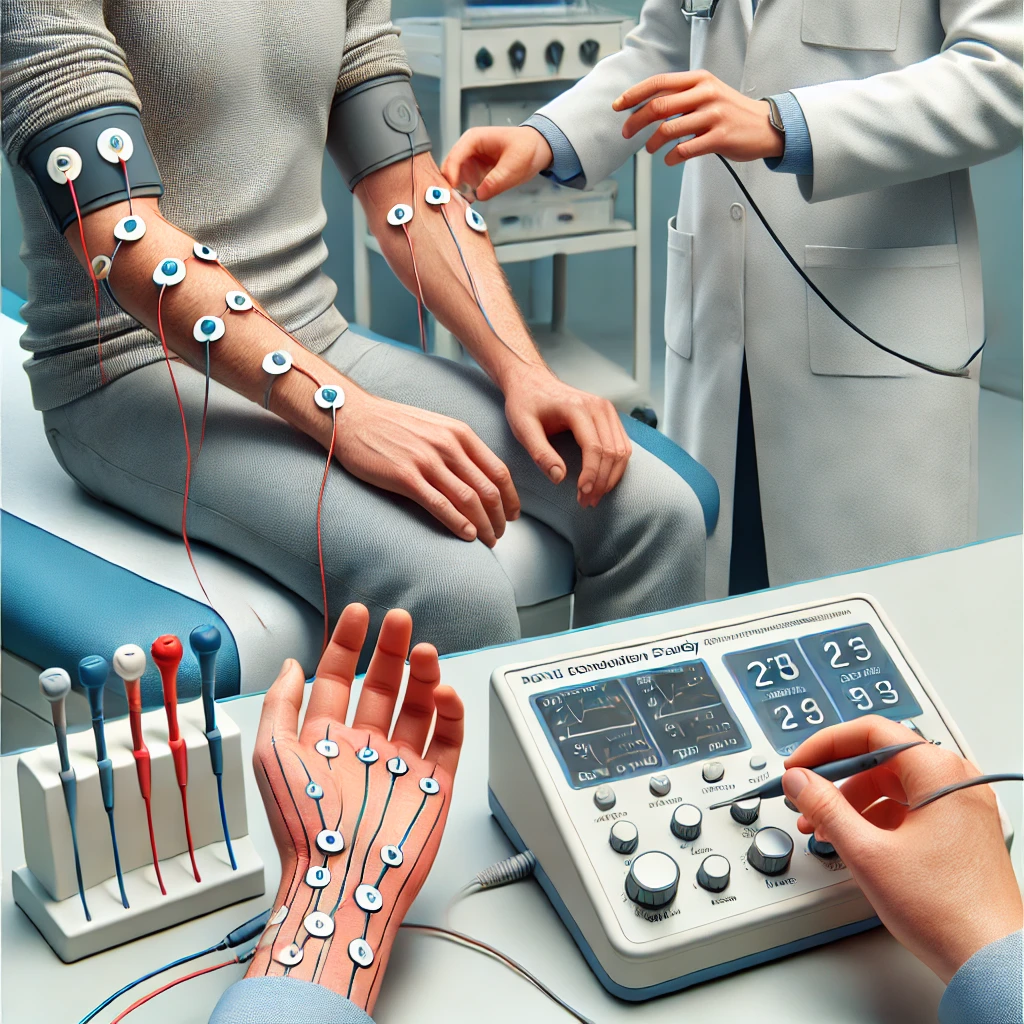 신경전도검사는 신경이 전기 신호를 얼마나 잘 전달하는지 평가하는 검사로, 손상된 신경의 위치와 손상 정도를 진단하는 데 사용됩니다. 검사 과정에서 피부 표면에 전극을 부착한 뒤, 신경에 전기 자극을 주고 반응 속도와 세기를 측정합니다.